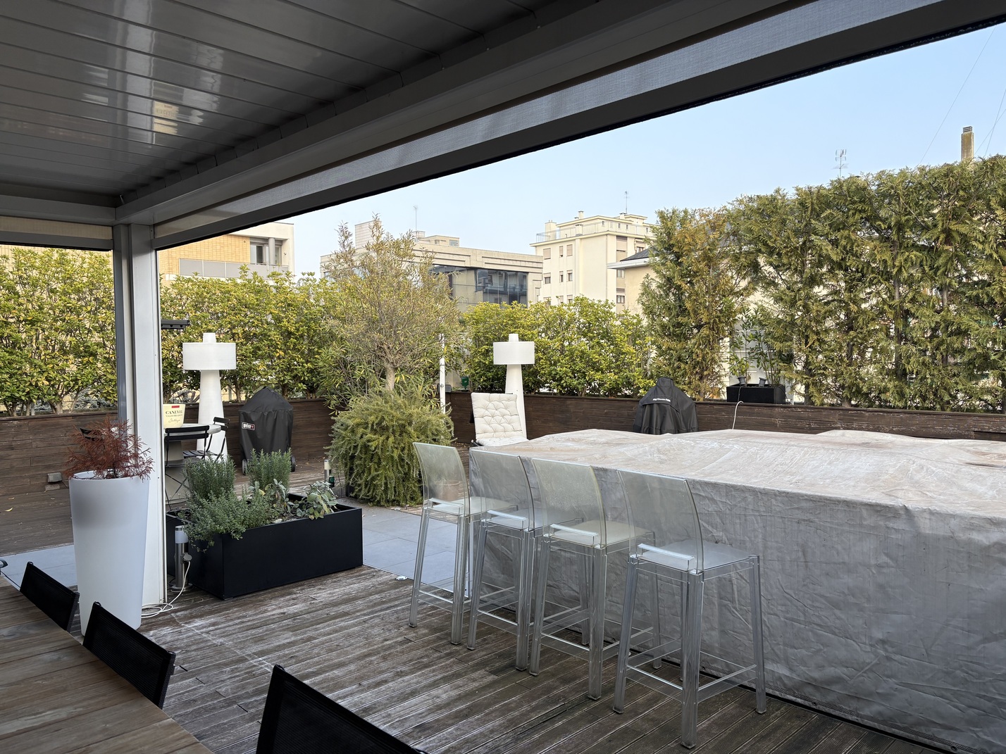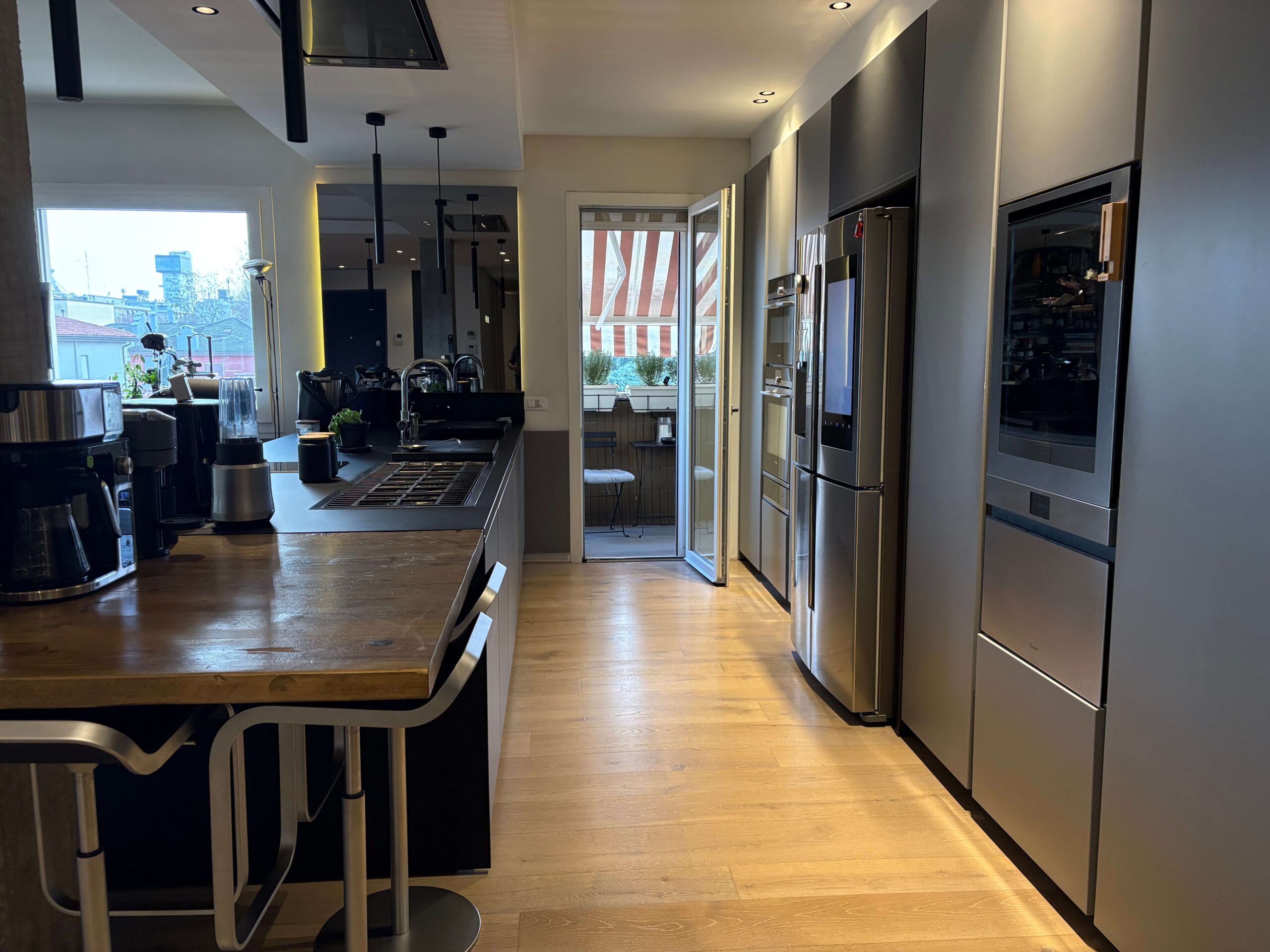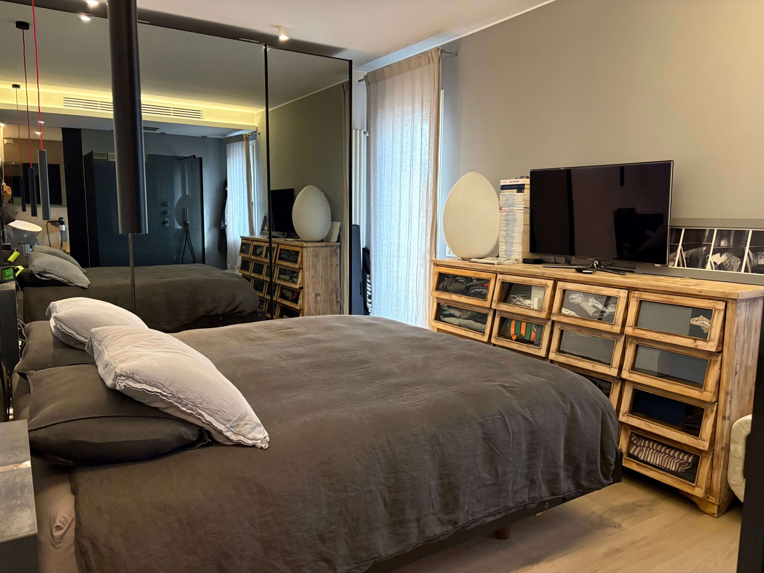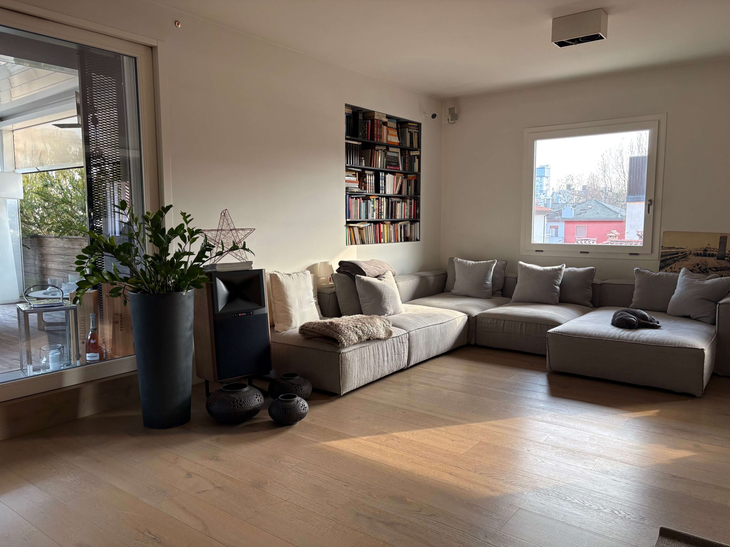 L’immobile, di 196 mq., si compone di ampio soggiorno con cucina a vista e caminetto a gas, terrazza di oltre 150 mq. con accesso dal soggiorno e dal pianerottolo, 4 camere da letto (2 matrimoniali, 1 doppia e 1 singola), doppi servi (uno all’interno della camera matrimoniale con doccia a vista e uno cieco completo con doccia), cabina armadio fruita anche come lavanderia, nr. 2 poggioli a livello, magazzino/soffitta al Piano Sesto e garage al Piano Terra, provvisto di presa per ricarica auto, di mt. 4,79 x 4,46 con entrata di mt. 2,75 e comoda manovra.