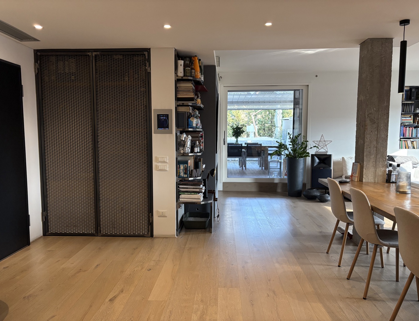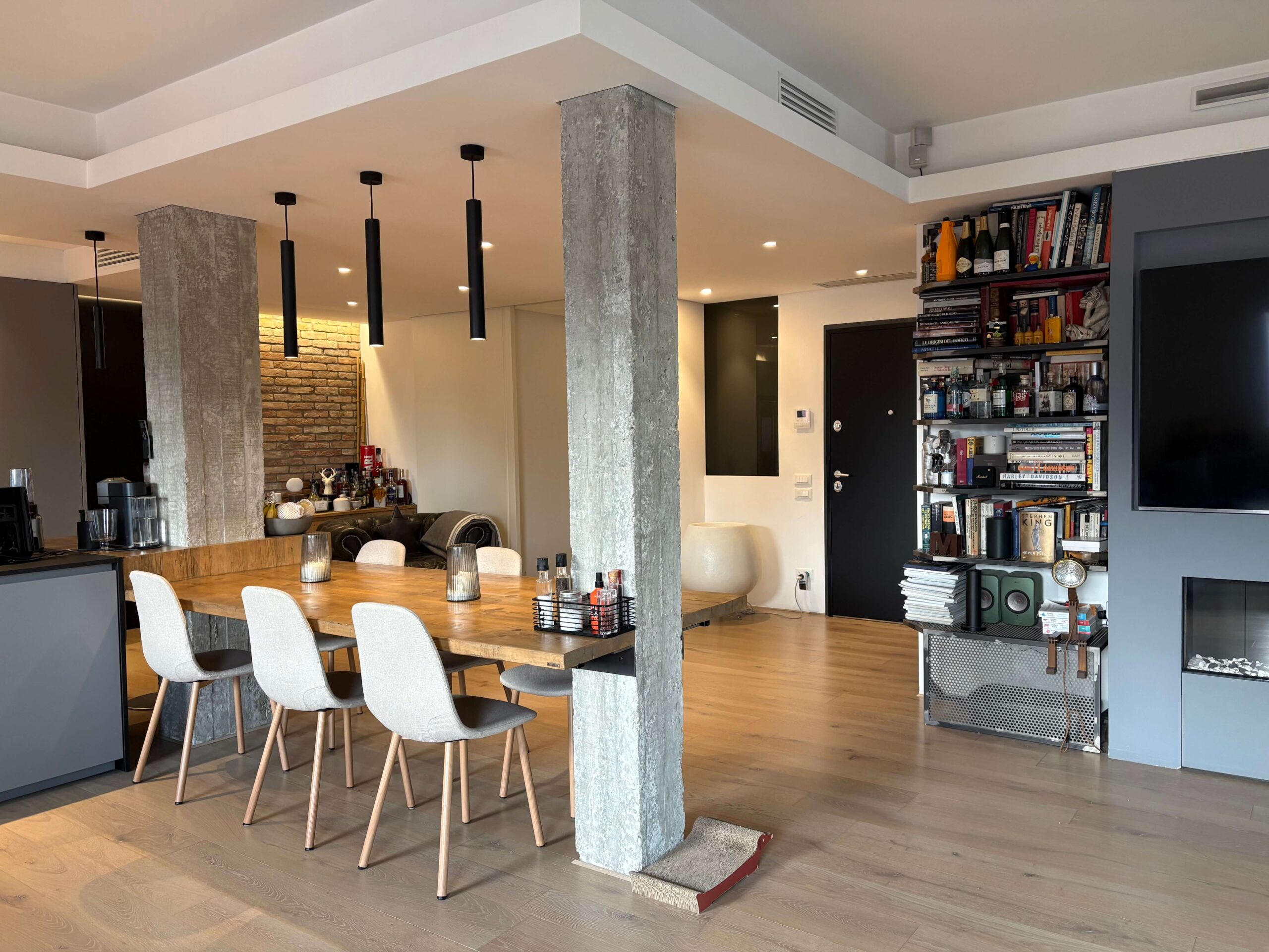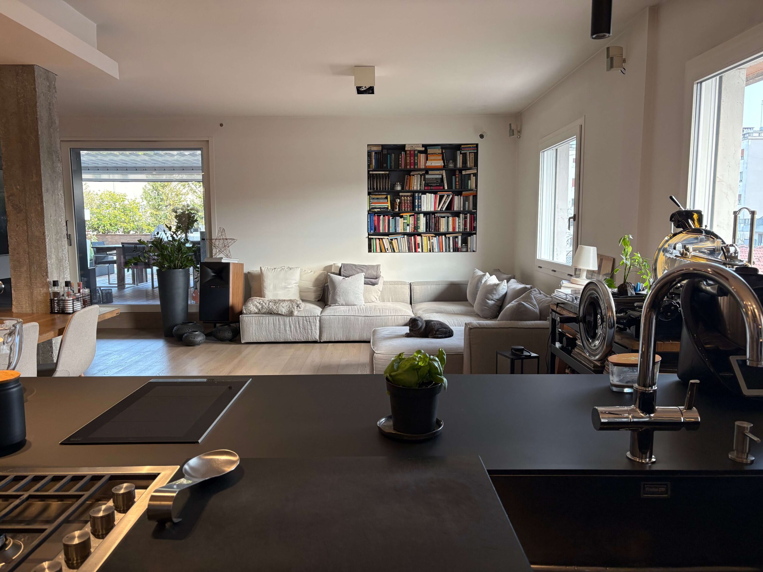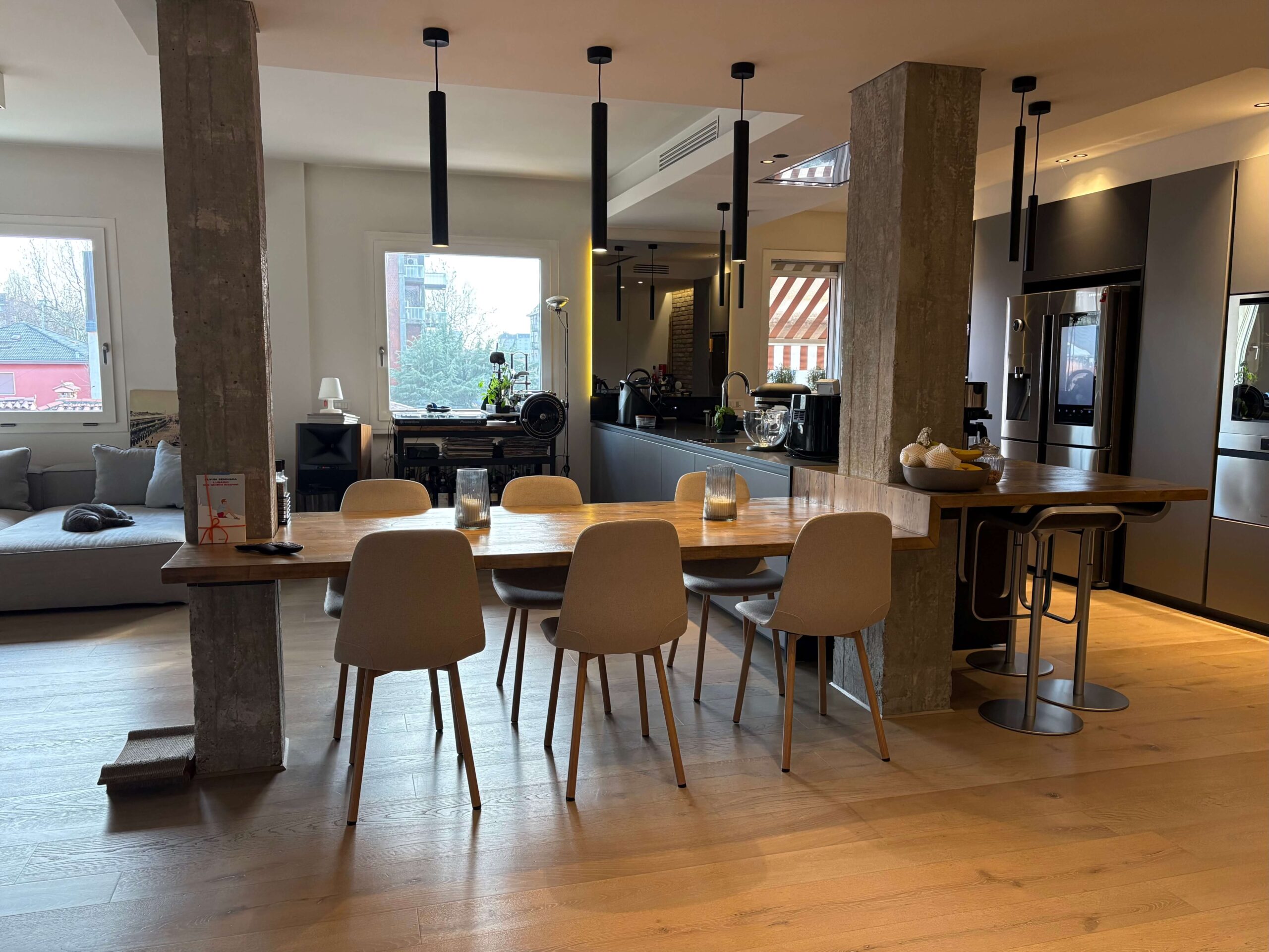 L’immobile, di 196 mq., si compone di ampio soggiorno con cucina a vista e caminetto a gas, terrazza di oltre 150 mq. con accesso dal soggiorno e dal pianerottolo, 4 camere da letto (2 matrimoniali, 1 doppia e 1 singola), doppi servi (uno all’interno della camera matrimoniale con doccia a vista e uno cieco completo con doccia), cabina armadio fruita anche come lavanderia, nr. 2 poggioli a livello, magazzino/soffitta al Piano Sesto e garage al Piano Terra, provvisto di presa per ricarica auto, di mt. 4,79 x 4,46 con entrata di mt. 2,75 e comoda manovra.