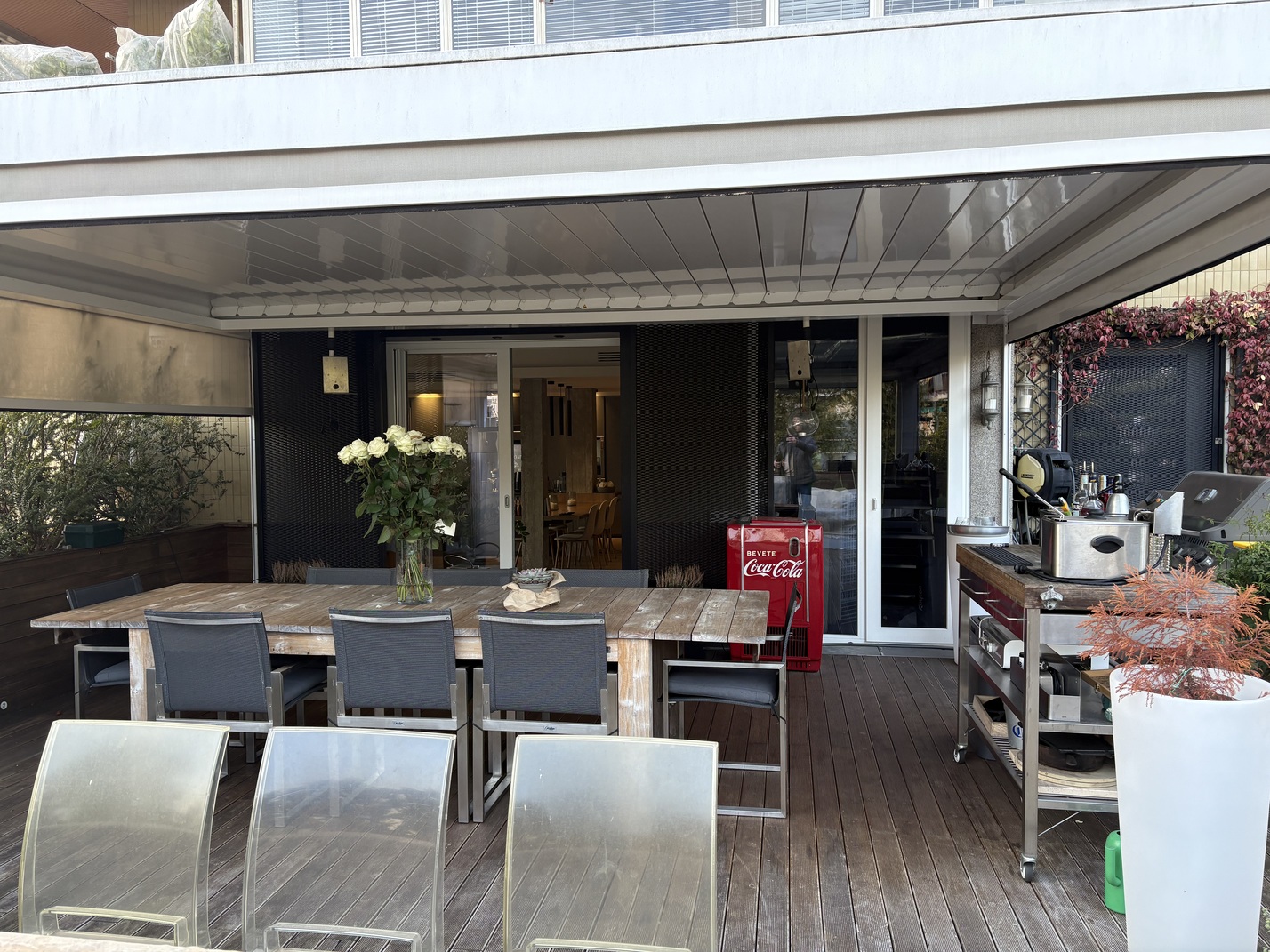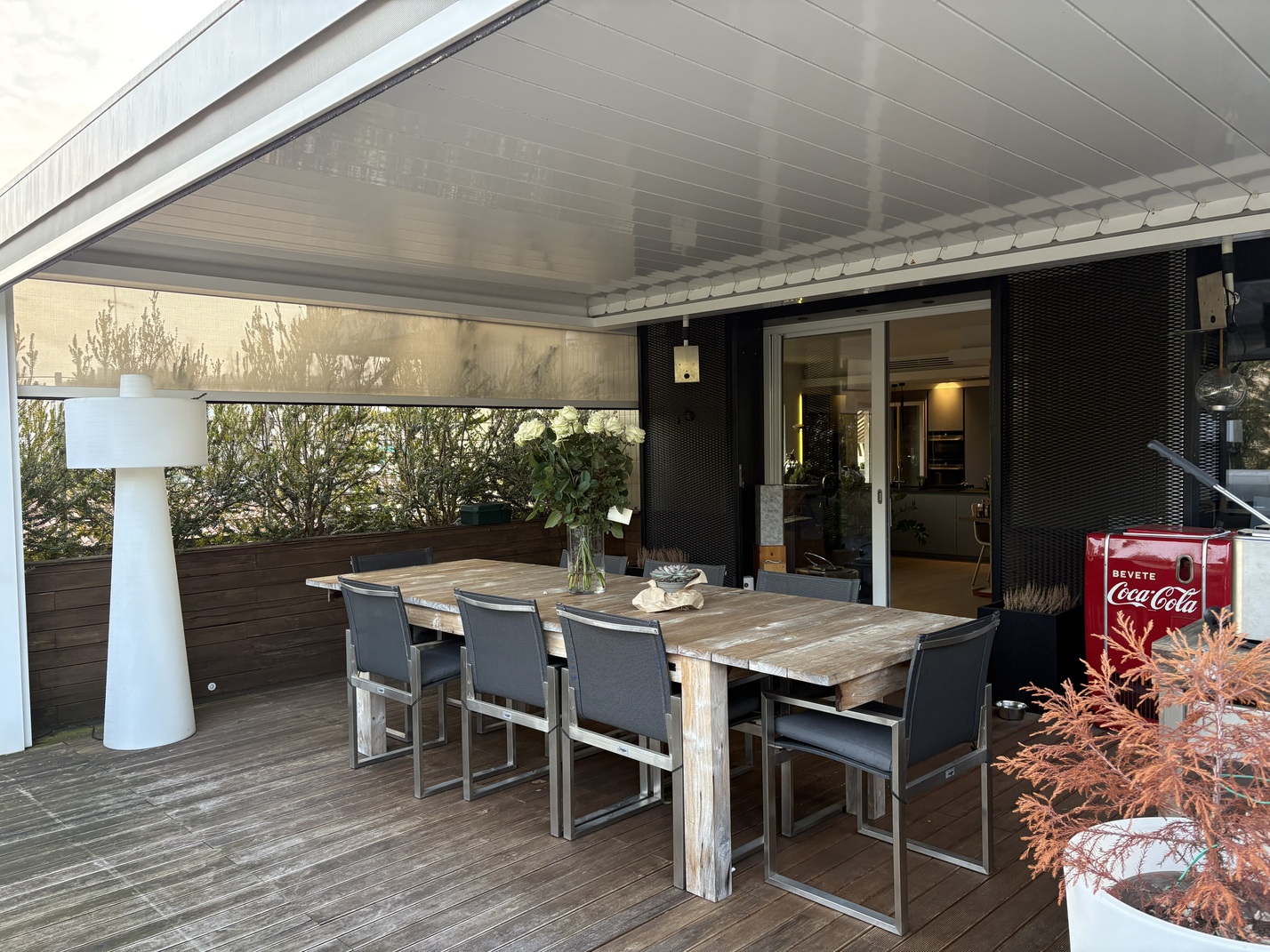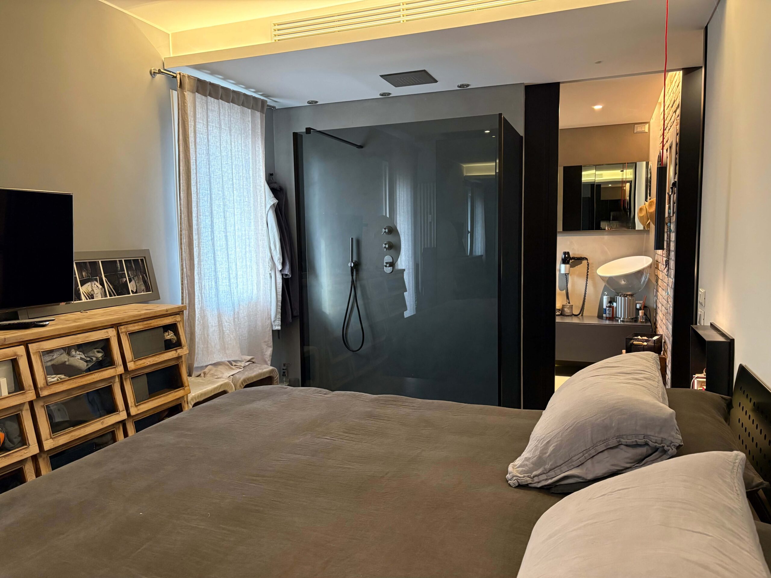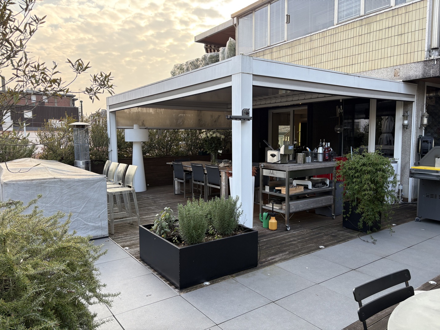 L’immobile, di 196 mq., si compone di ampio soggiorno con cucina a vista e caminetto a gas, terrazza di oltre 150 mq. con accesso dal soggiorno e dal pianerottolo, 4 camere da letto (2 matrimoniali, 1 doppia e 1 singola), doppi servi (uno all’interno della camera matrimoniale con doccia a vista e uno cieco completo con doccia), cabina armadio fruita anche come lavanderia, nr. 2 poggioli a livello, magazzino/soffitta al Piano Sesto e garage al Piano Terra, provvisto di presa per ricarica auto, di mt. 4,79 x 4,46 con entrata di mt. 2,75 e comoda manovra.