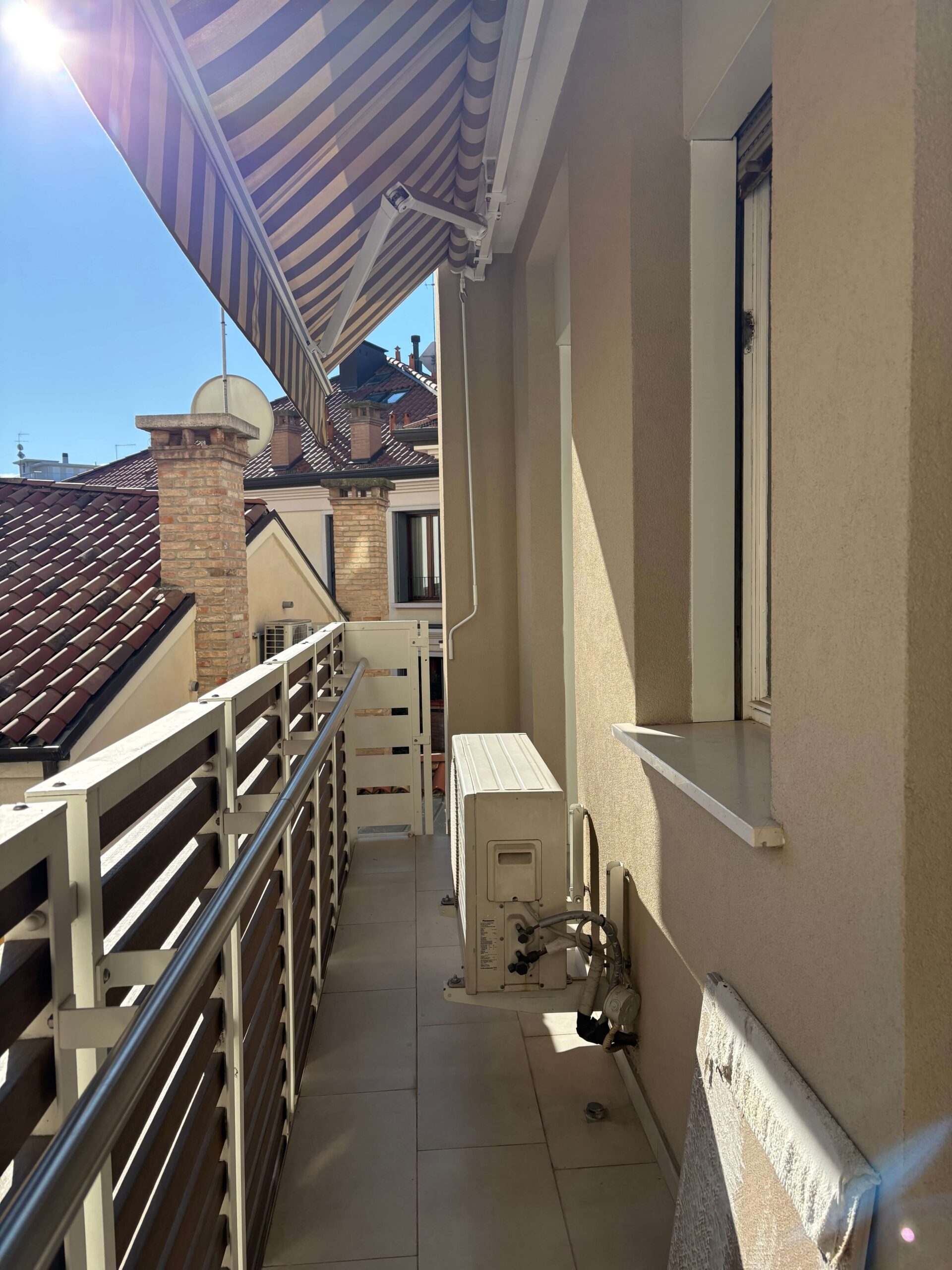 L’immobile si compone di ingresso/corridoio, soggiorno di dimensioni contenute, cucina con cucinino, 2 camere da letto (1 matrimoniale, 1 singola), servizio finestrato con doccia, armadiatura a muro, nr. 1 poggiolo con accesso dal soggiorno e dalla cucina, magazzino/soffitta al Piano Quinto con accesso dalla terrazza condominiale, posto auto coperto a rotazione.