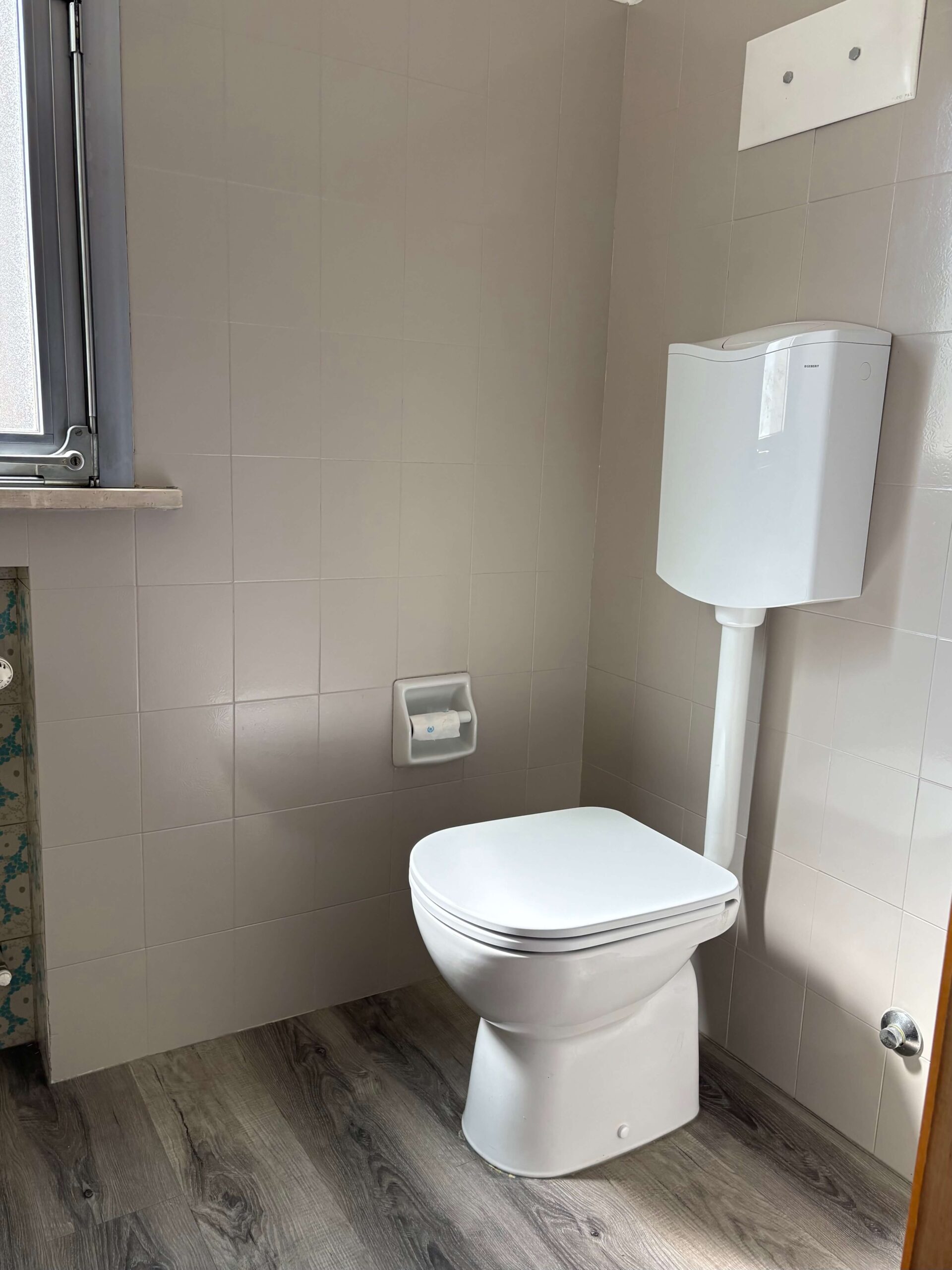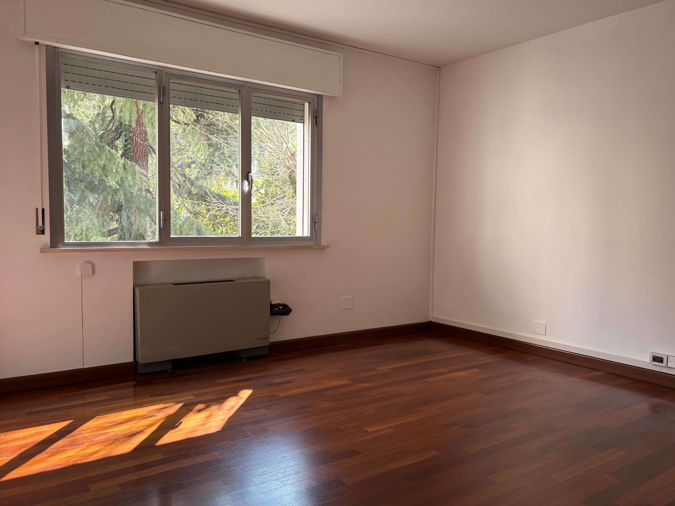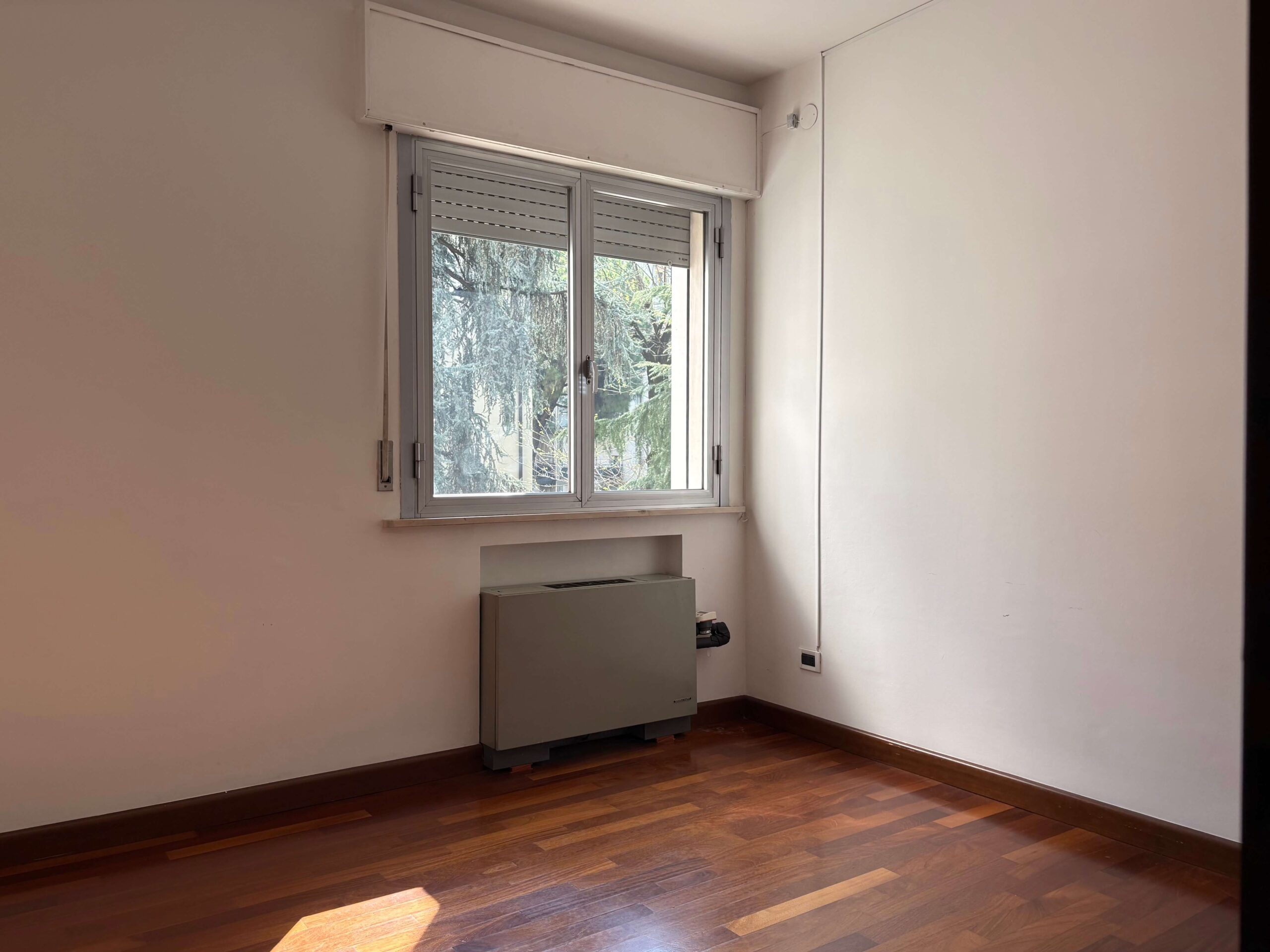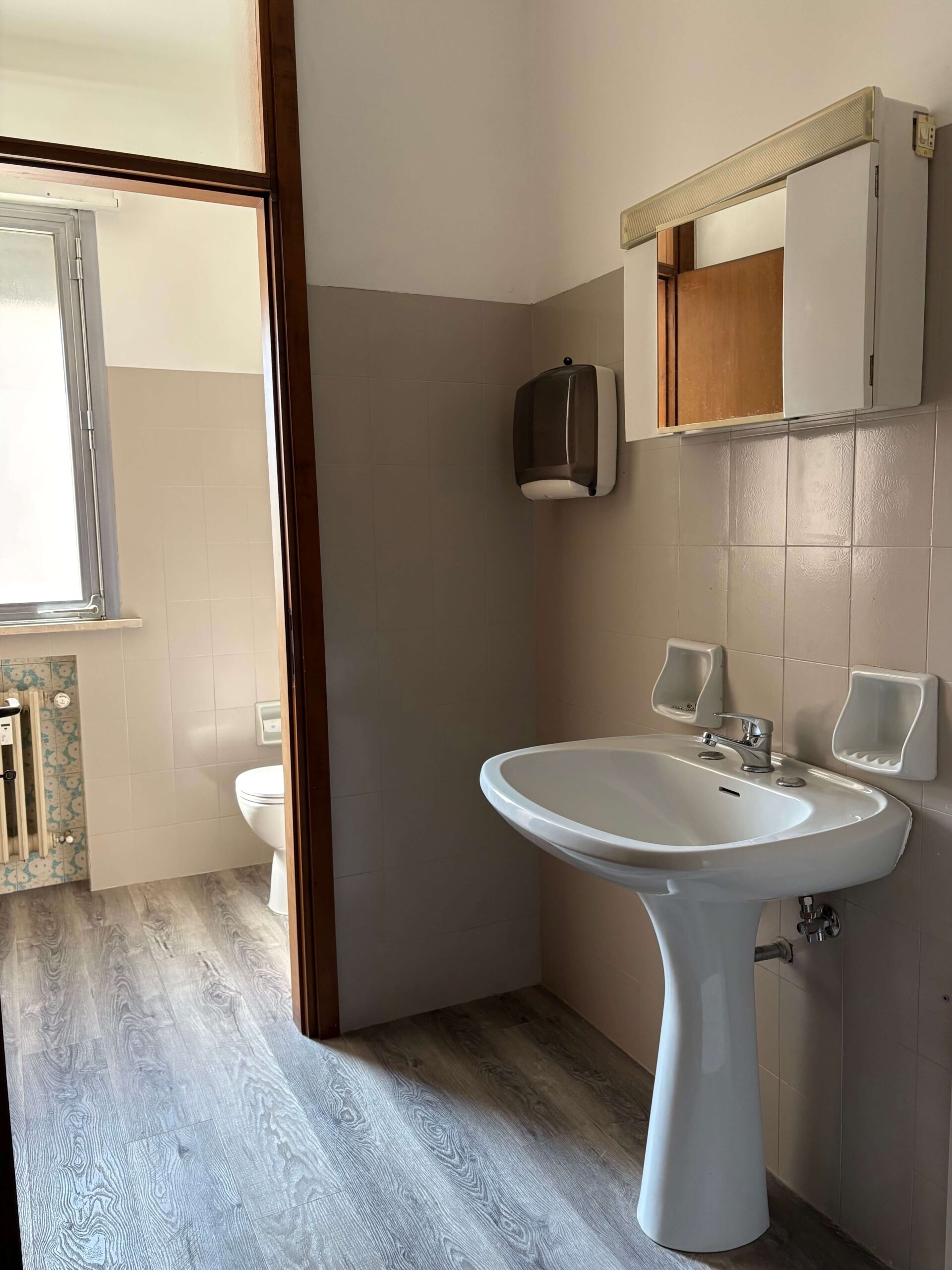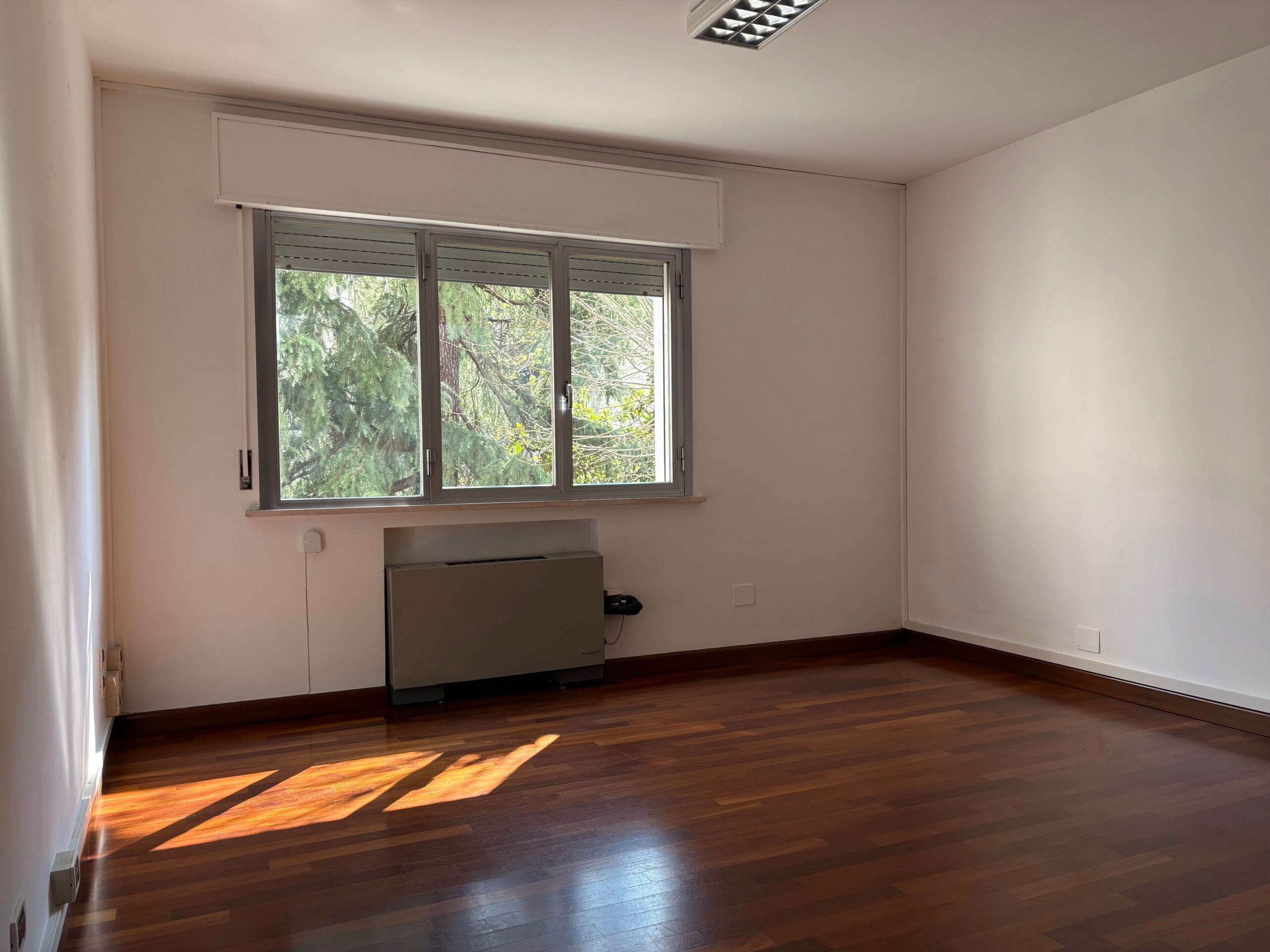 L’ufficio presenta pavimenti in legno tranne nel servizio in piastrelle e serramenti in alluminio con vetro singolo.
